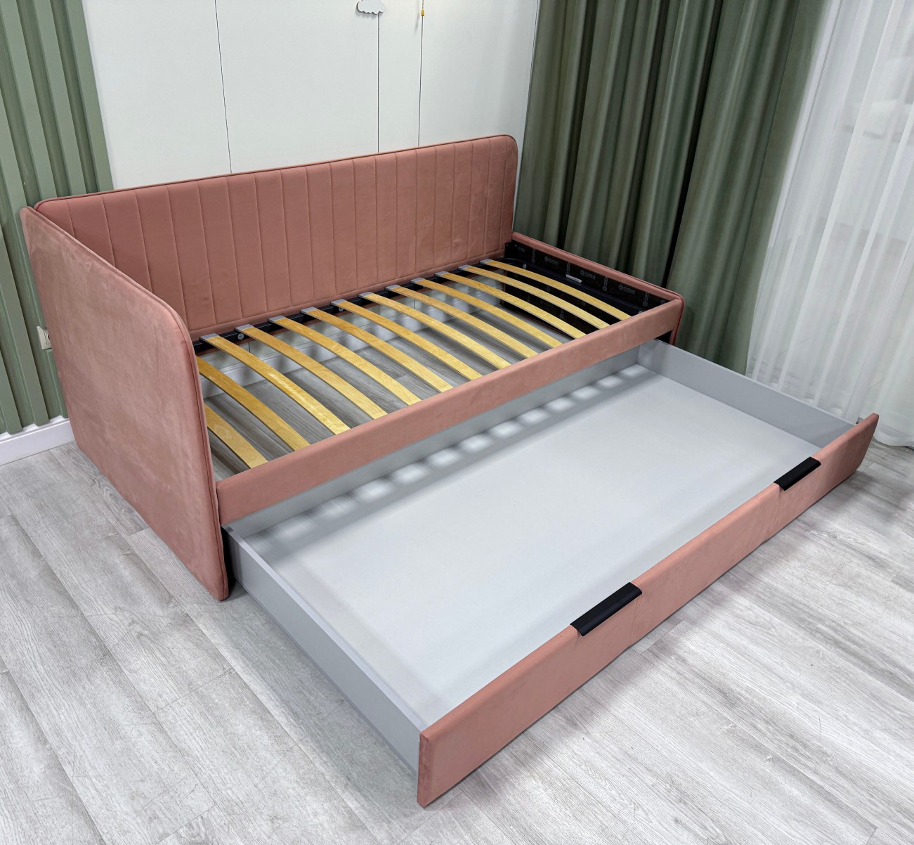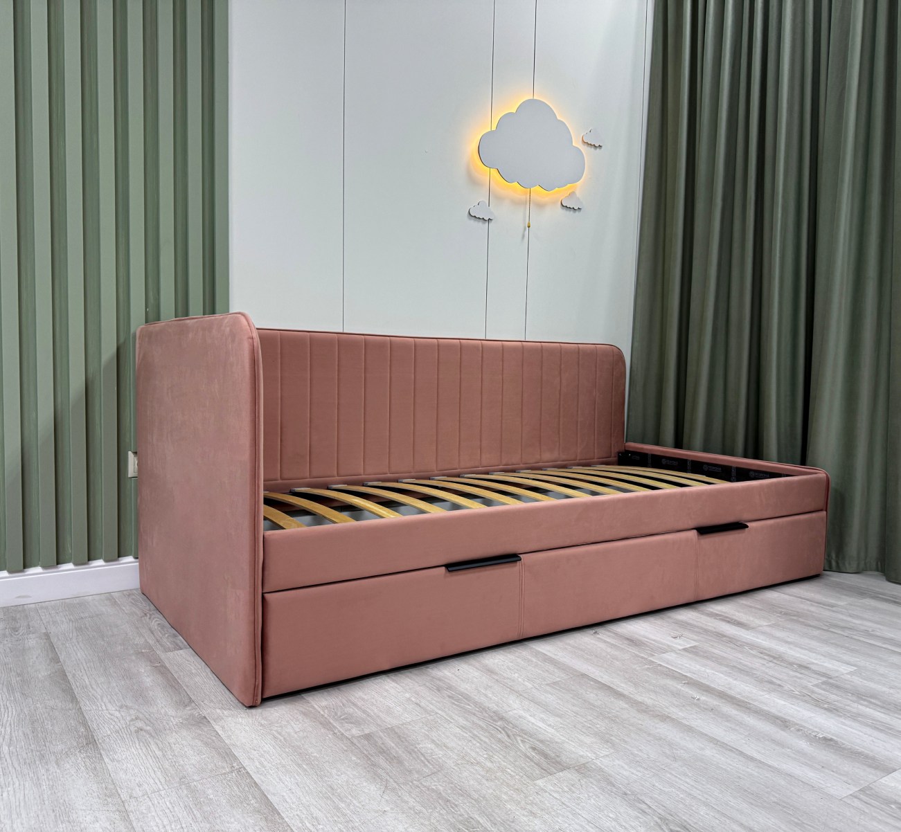 Детская кровать ELLA с вертикальной строчкой и выдвижным ящиком сочетает в себе функциональность, стиль, удобство и комфорт, делая ее отличным выбором для детской комнаты.