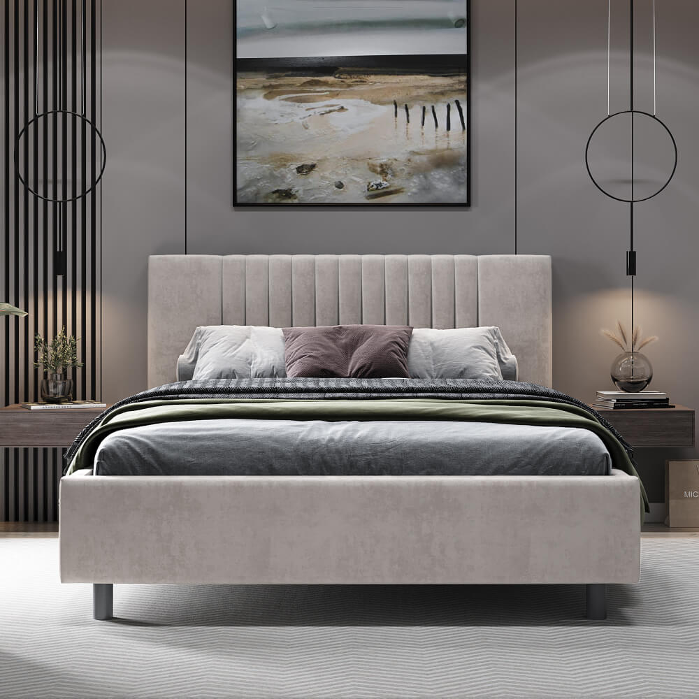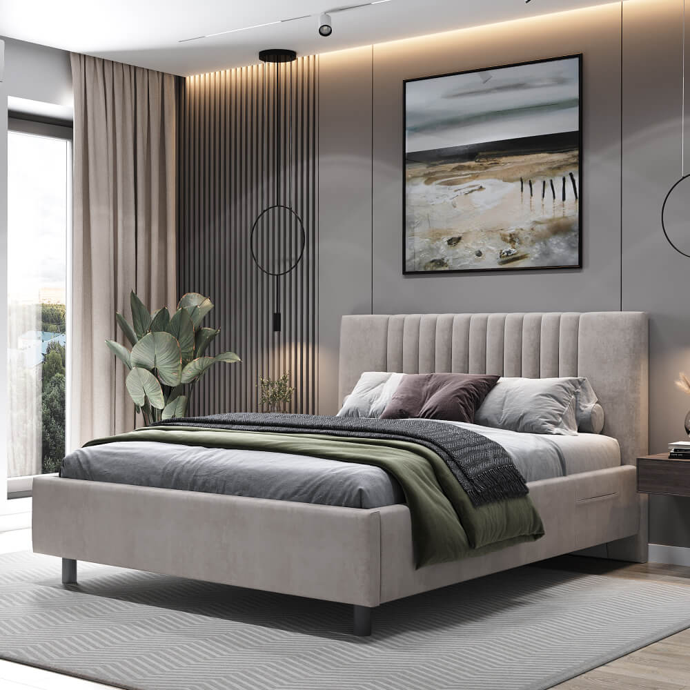 Достоинства данной кровати — это актуальный дизайн с вертикальными полосами, который отлично впишется в современный интерьер. Наличие ножек обеспечивает беспрепятственную работу робота-пылесоса. Модель кровати также оснащена удобными карманами на царгах с обеих сторон, обеспечивая оптимальное сочетание функциональности и доступной стоимости.