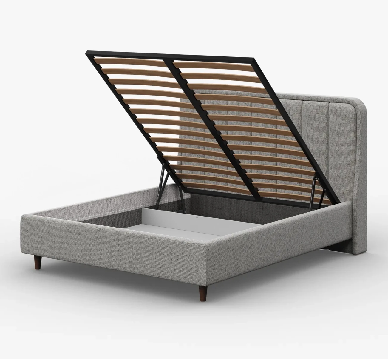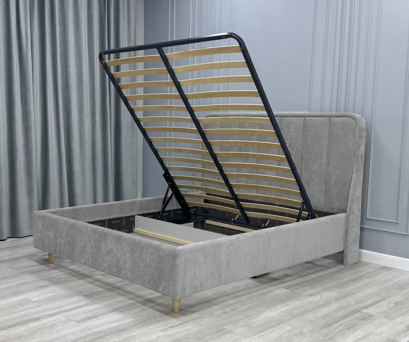 Дизайн изголовья формируется из округлой рамки и отдельных вертикальных вставок, которые изготавливаются и обтягиваются отдельно. Благодаря такому сочетанию все элементы изголовья имеют ярко выраженную выпуклую форму, что придает кровати премиальный внешний вид. Объемные мягкое изголовье